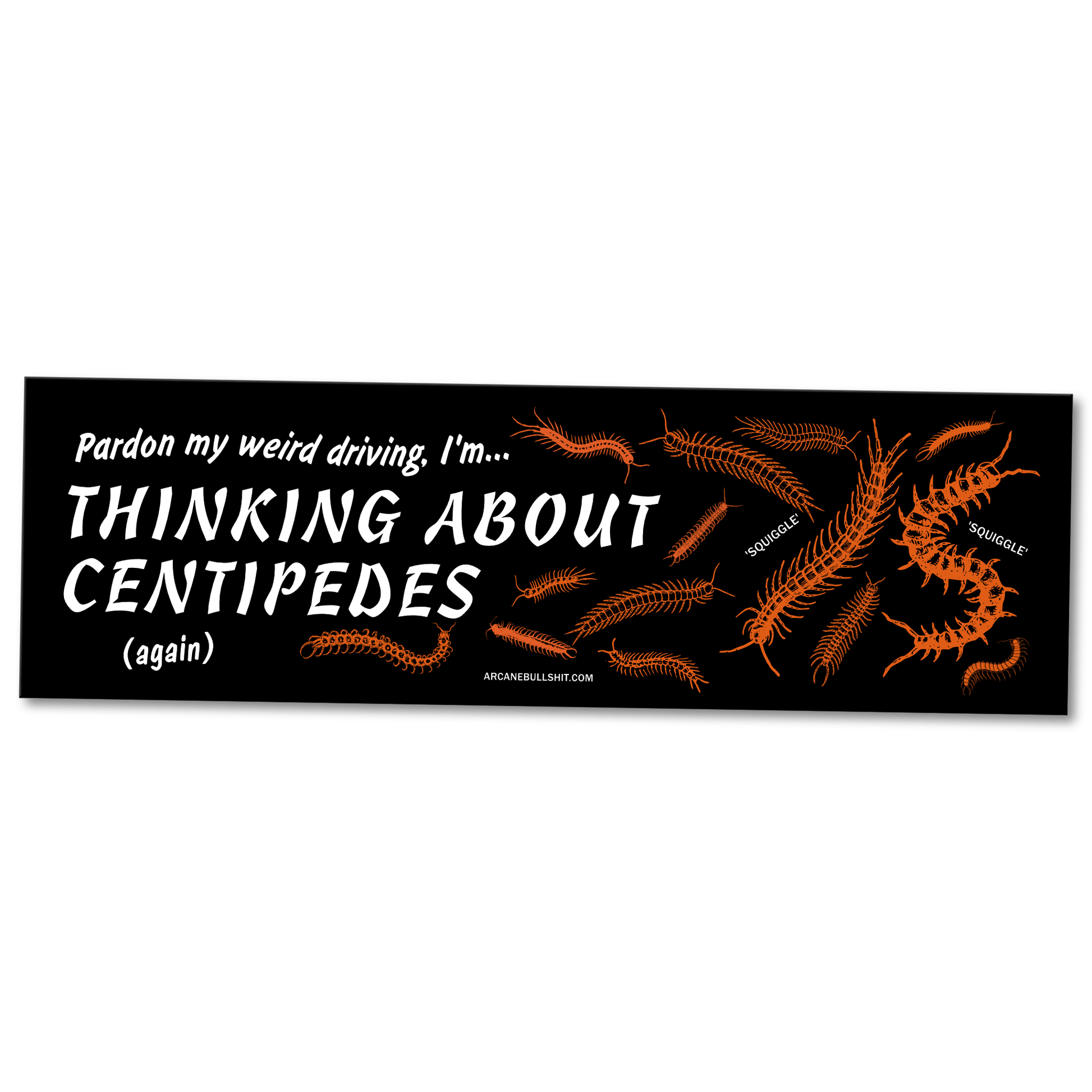 Can’t stop thinking about centipedes while driving? Get this 12″ x 3.5″ matte vinyl bumper magnet. The perfect vehicle accessory to explain your frantic vehicular squiggling!