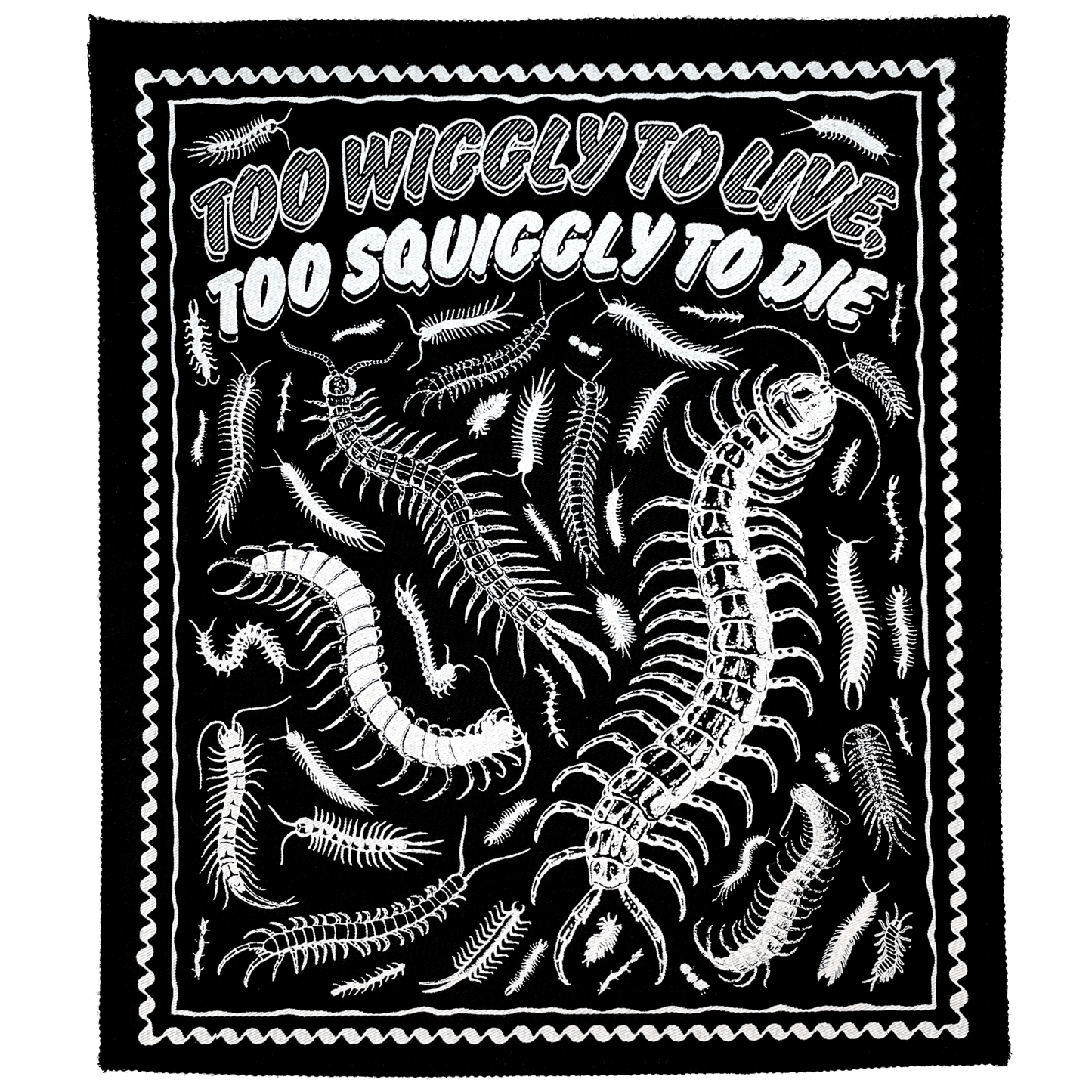 Centipedes: you either love them or you hate them. But I say, why not both? They're patently disgusting and extremely un-human-like, but we have to share deserts and basements and moist crevasses with them, so why not learn to appreciate their alien and truly uncanny charms? Here is a cool 10" x 12" sew-on back patch which reads "Too Wiggly to Live, Too Squiggly to Die" and has a whole bunch of upsetting little squigglers on it.