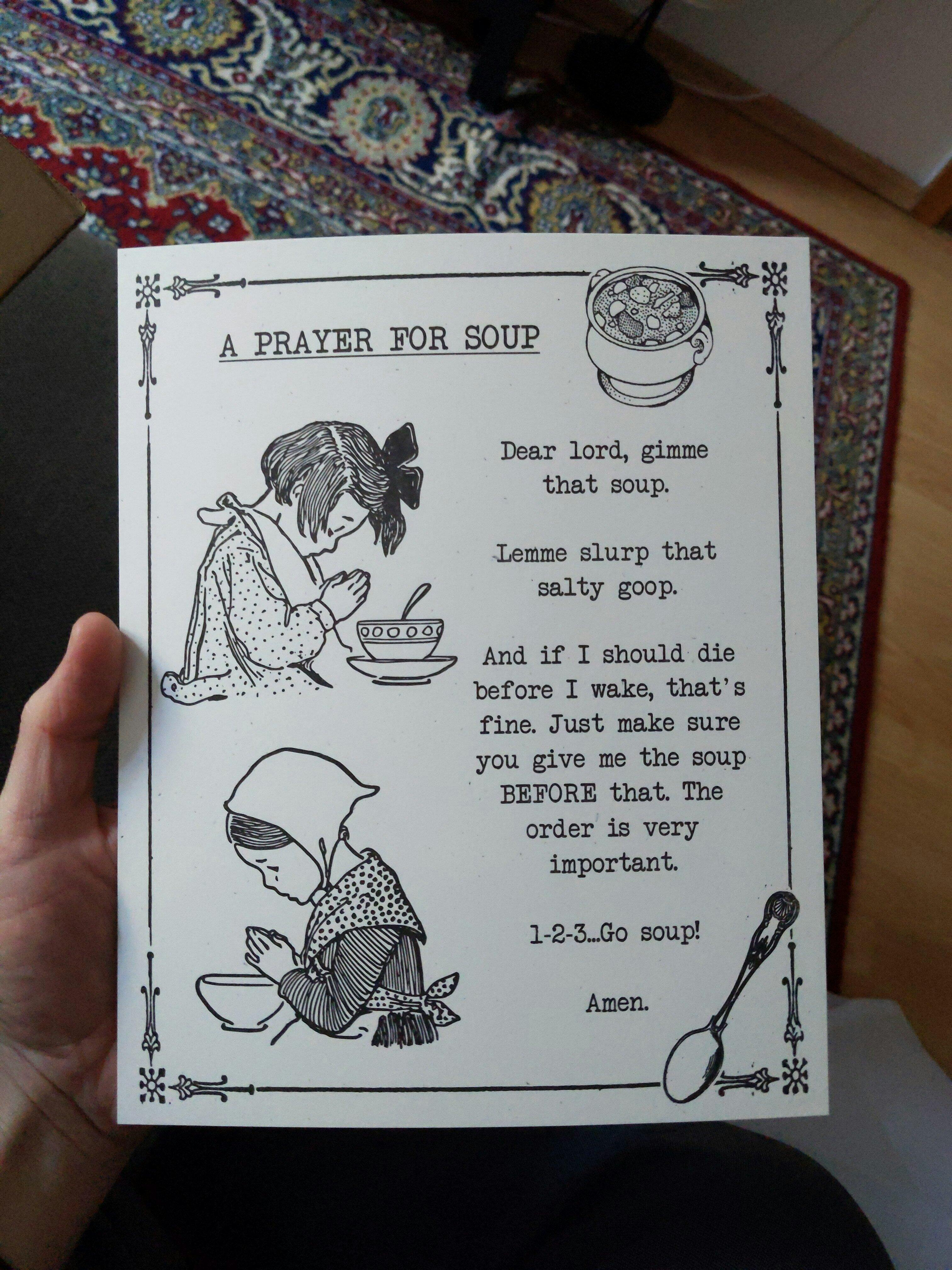It's a little 8" x 10" poster for very religious people only. 1-2-3...Go soup!